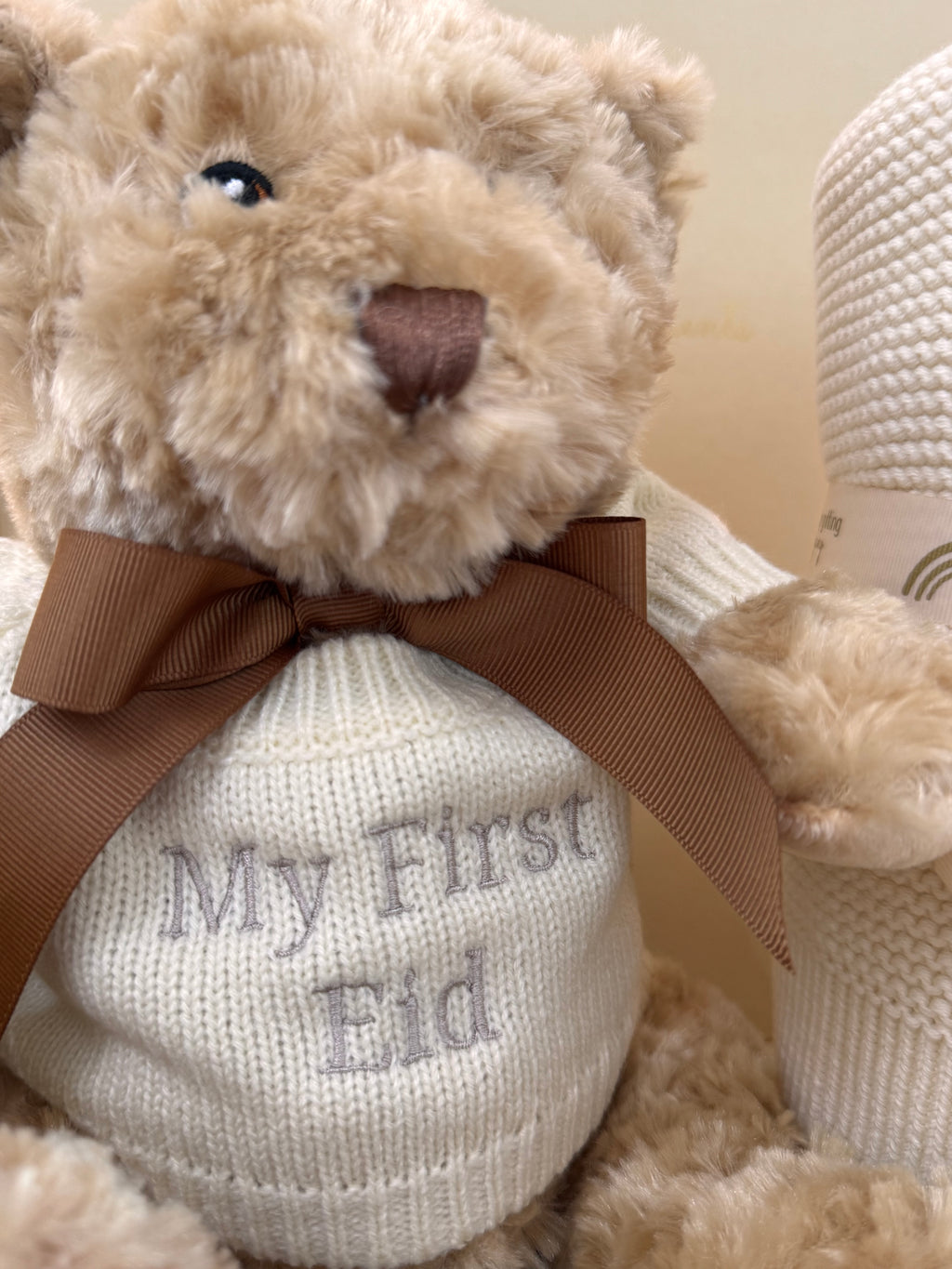 Finished with an elegant gold “My First Eid” embroidery on the teddy’s jumper, it’s a timeless keepsake to celebrate a special milestone.